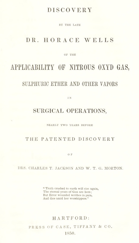 Cover page to a pamphlet outlining the claim of the late Dr. Horace Wells as the discoverer of anaesthesia. Contains testimony and a sworn letter in support from William T. Burleigh
