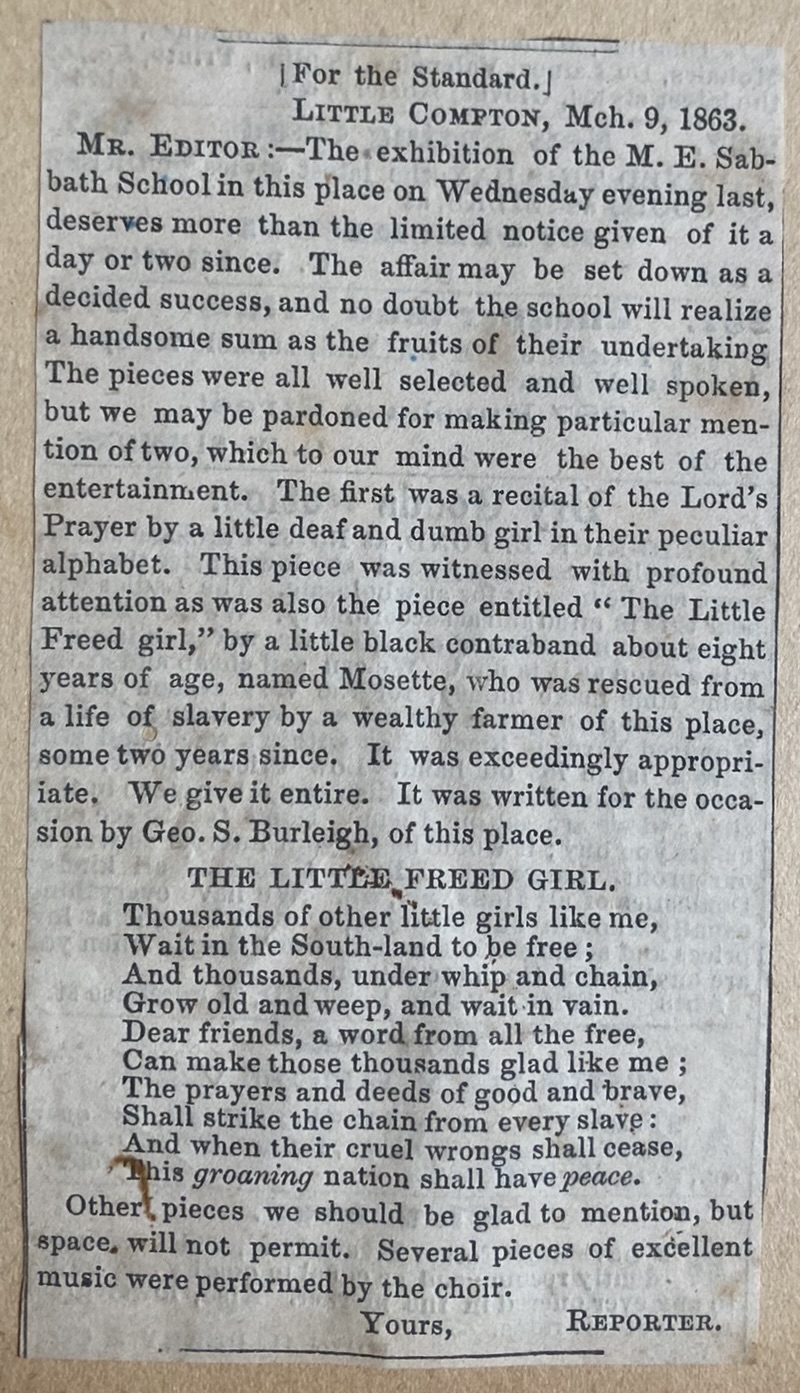 Mr. Editor: — The exhibition of the M. E. Sabbath School in this place on Wednesday evening last, deserves more than the limited notice given of it a day or two since. The affair may be set down as a decided success, and no doubt the school will realize a handsome sum as the fruits of their undertaking[.] The pieces were all well selected and well spoken, but we may be pardoned for making particular mention of two, which to our mind were the best of the entertainment. The first was a recital of the Lord’s Prayer by a little deaf and dumb girl in their peculiar alphabet. This piece was witnessed with profound attention as was also the piece entitled “The Little Freed girl,” by a black contraband about eight years of age, named Mosette, who was rescued from a life of slavery by a wealthy farmer of this place, some two years since. It was exceedingly appropriate. We give it entire. It was written for the occasion by Geo. S. Burleigh, of this place.