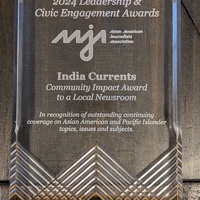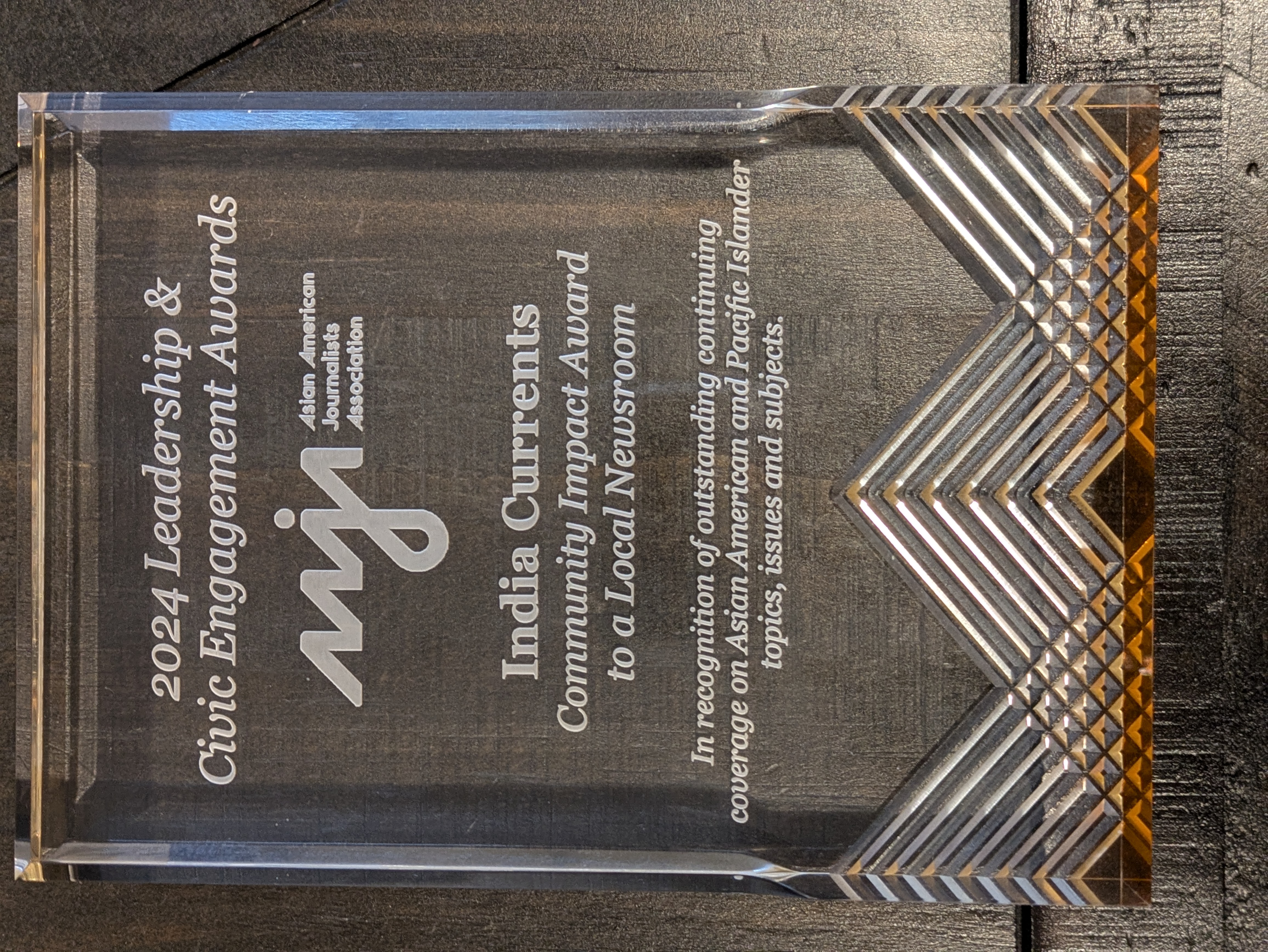 Photograph of the 2024 Leadership & Civic Engagement Award presented to India Currents by the Asian American Journalists Association (AAJA). The award recognizes India Currents for its “outstanding continuing coverage on Asian American and Pacific Islander topics, issues and subjects.”