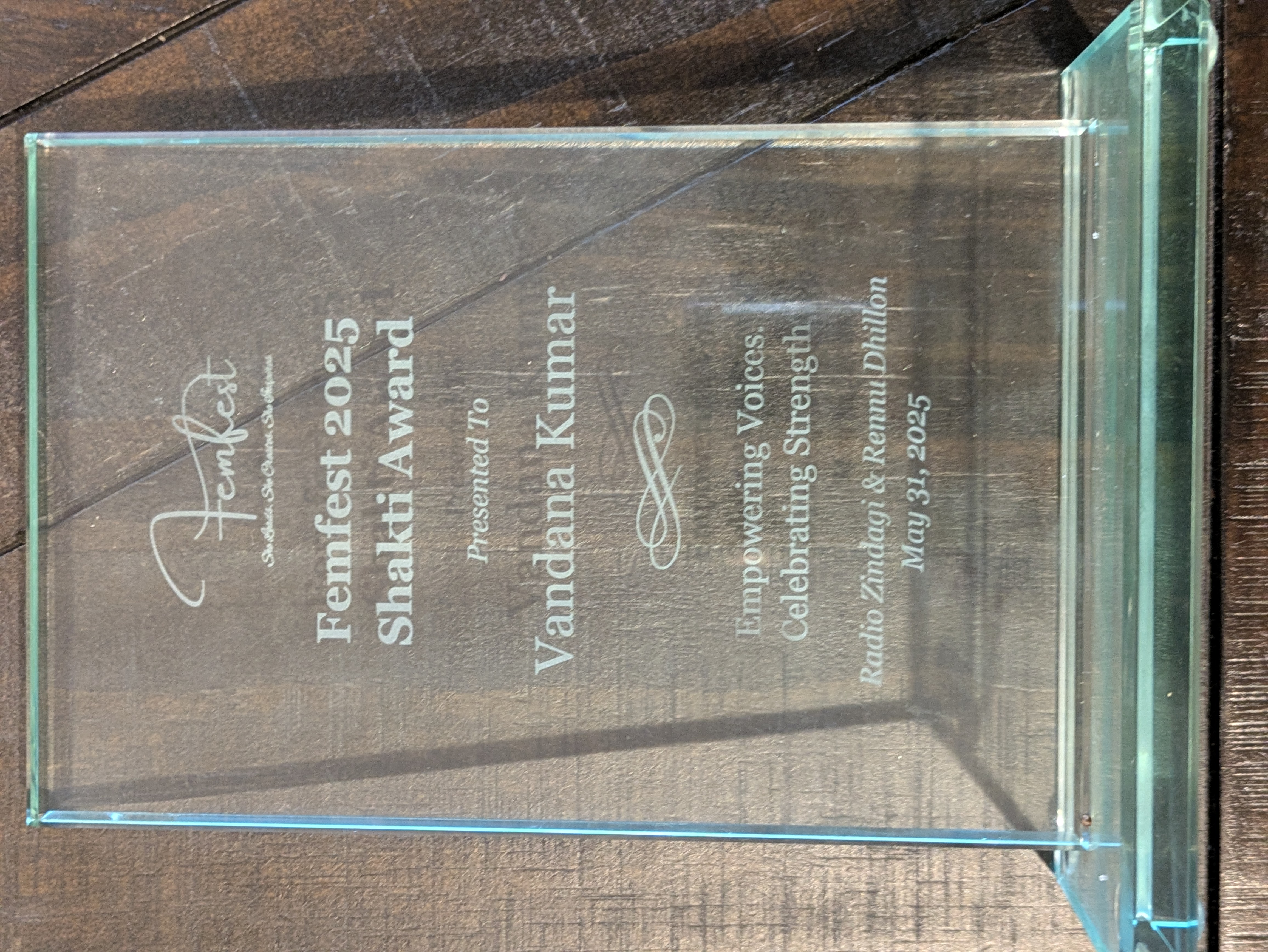 Photograph of the Femfest 2025 Shakti Award presented to Vandana Kumar, longtime publisher of India Currents magazine. Awarded on May 31, 2025, the honor recognizes her contributions to empowering community voices and strengthening South Asian representation in American media.