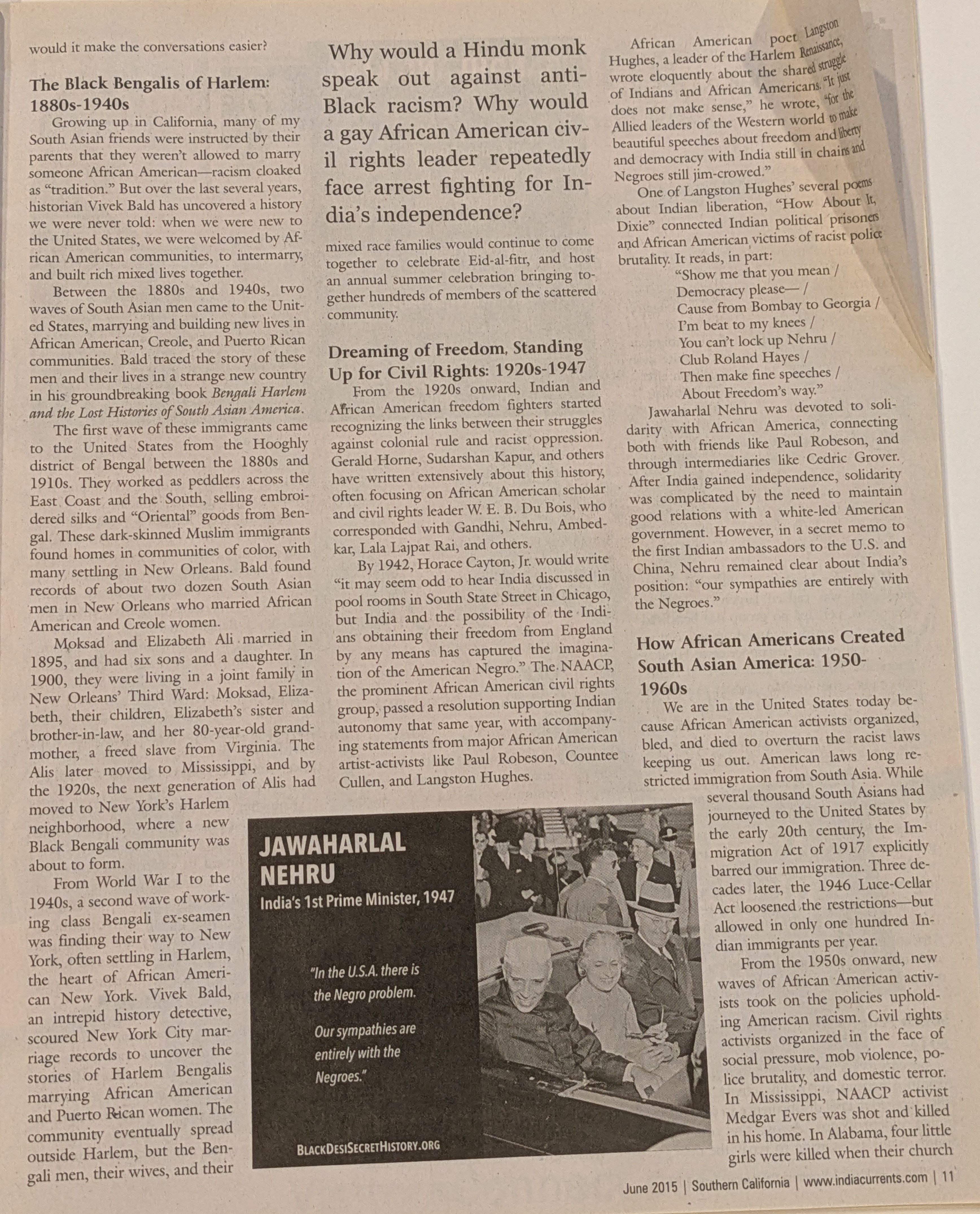 Black and Desi: A Shared History,” written by Anirvan Chatterjee and published in the June 2015 issue of India Currents, is a landmark article tracing over a century of solidarity between African Americans and South Asians in the United States.