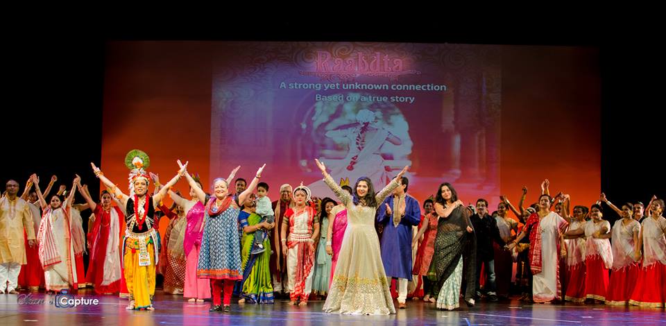 A post-show image of the cast and creative team of a dance-theatre performance, Raabdta, which is a dance-theatre production about discovering a deep, emotional connection to one’s home, homeland and cultural roots through nostalgic traditions and heritage.
