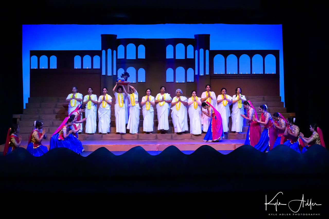 Vrindavan is a Naatak original musical inspired by contemporary debates surrounding widows living in the temple town of Vrindavan, India. The play follows a group of widows whose tightly structured lives are disrupted by the arrival of a public figure, sparking confrontation, humor, and unexpected forms of solidarity.Blending classical references with popular culture, the production juxtaposes devotional traditions associated with Radha and Krishna alongside Bollywood music and theatrical spectacle. Through this interplay, Vrindavan examines gender, marginalization, and agency, while situating these issues within both Indian social contexts and the diasporic imagination of Silicon Valley audiences.This image captures an ensemble moment of ritual and performance, with widows in white contrasted against vividly dressed dancers, visually reinforcing the play’s tension between austerity and expression.