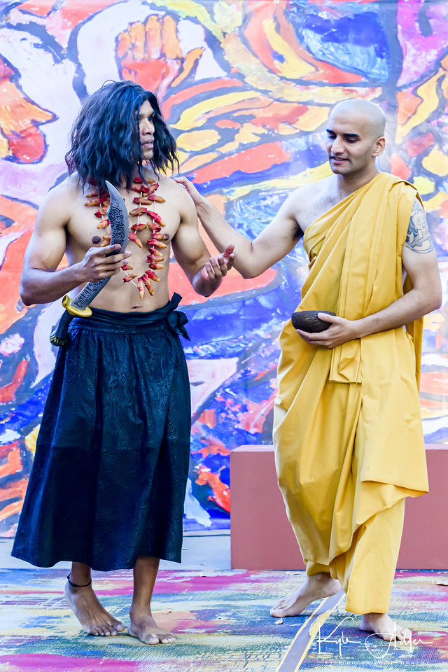 Buddha is a Naatak original musical that traces the life of Siddhartha Gautama, from his departure from royal life to his attainment of enlightenment and his journey as a teacher. Set in the sixth century BCE and written in verse, the play combines narrative, music, and choreography to explore themes of renunciation, compassion, and transformation. Staged outdoors, the production uses ensemble performance and visual design to create a fluid, immersive theatrical experience. This image captures an interaction between two contrasting figures, one representing worldly life and the other spiritual transformation, visually emphasizing the play’s central tension between material desire and the path toward enlightenment.