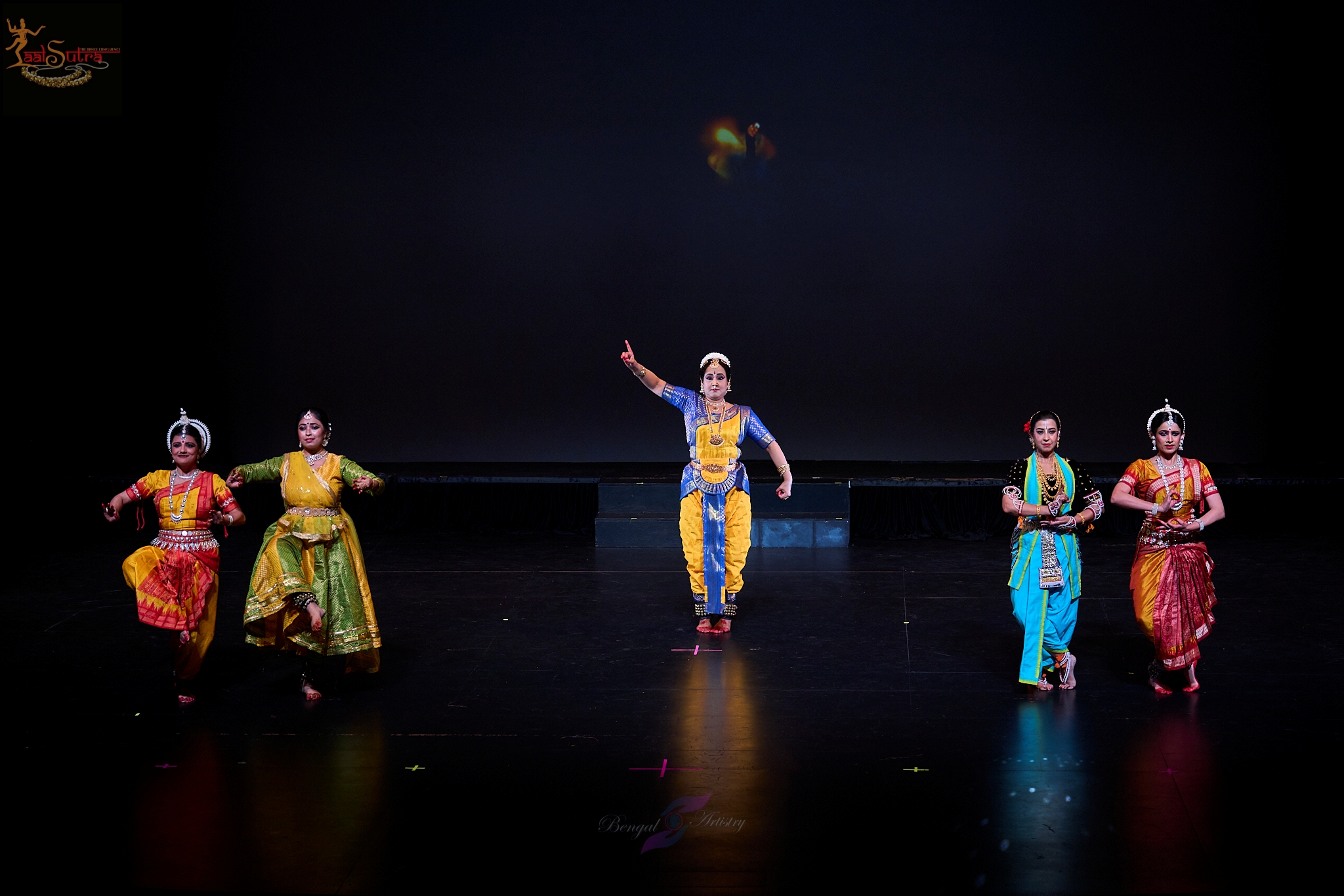 Under radiant projection, dancers representing multiple classical traditions share the stage in layered formation. Referencing the Bhagavad Gita’s promise of divine return, the segment emphasizes unity across stylistic diversity within South Asian performance traditions.