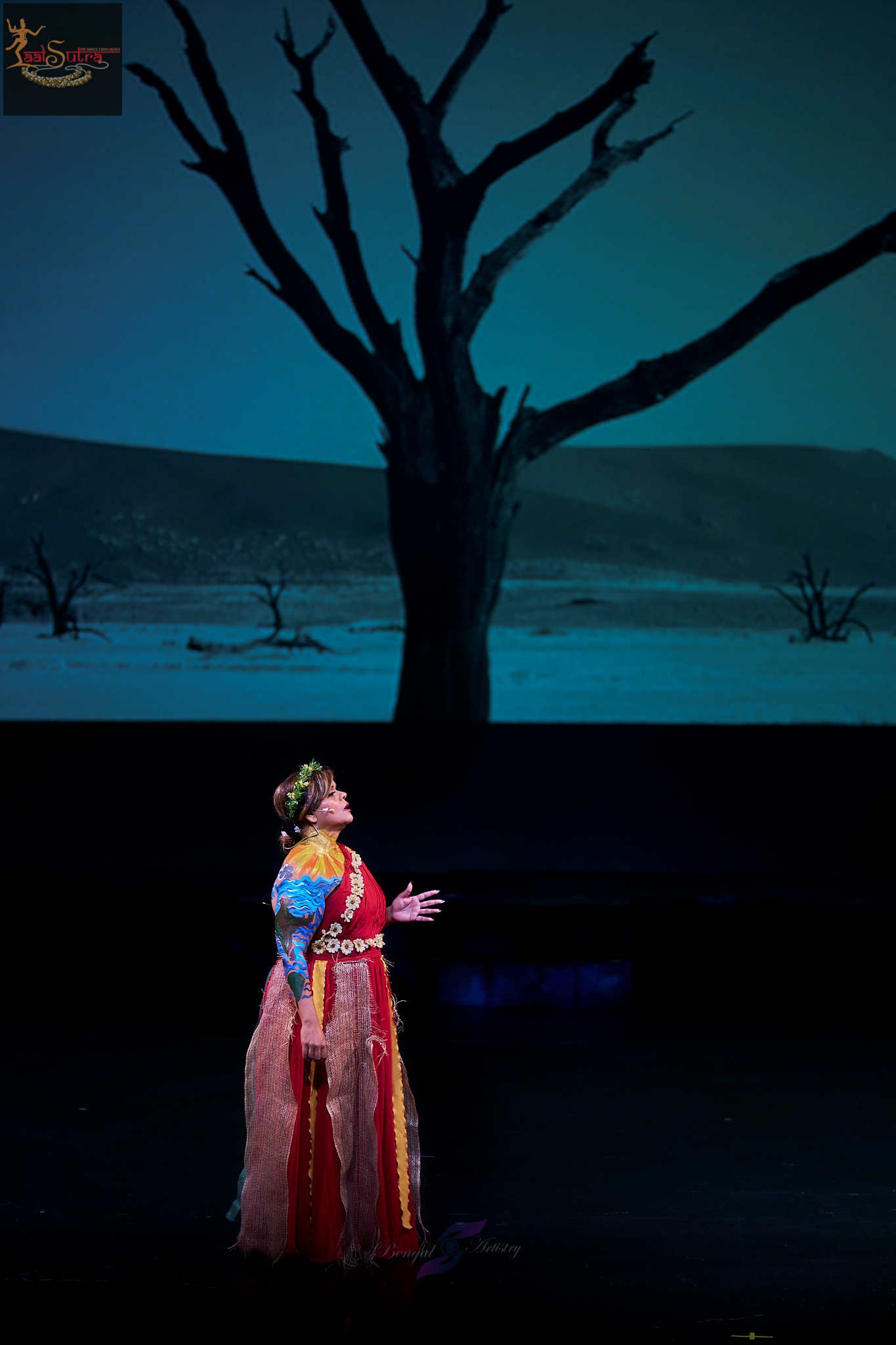 A stark, leafless tree dominates the projection, casting the stage in cool, desaturated tones. The minimal landscape imagery contrasts sharply with earlier mythic abundance, visually signaling ecological rupture and the fragility of creation.