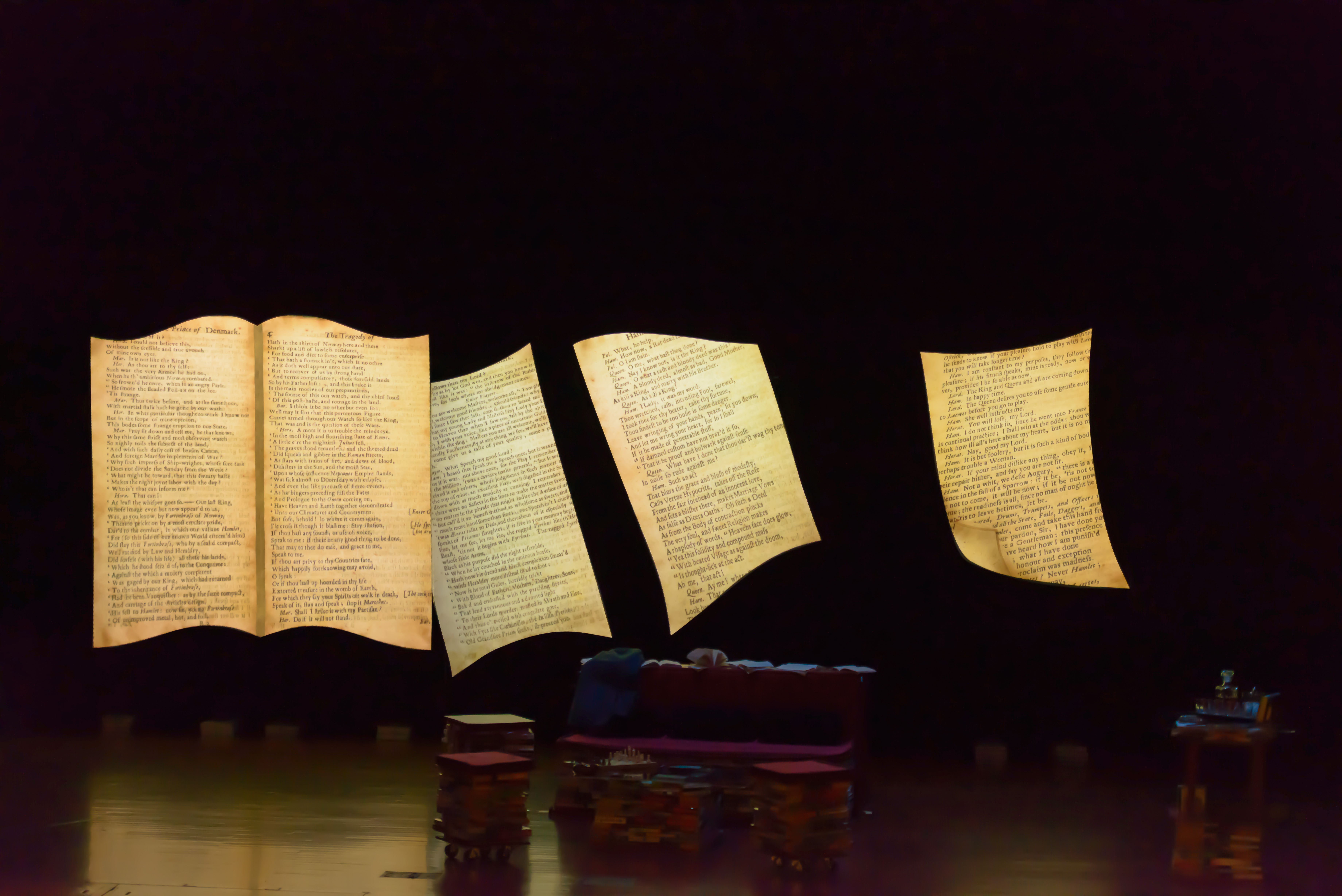 - The Chaos Theory set design comprises an open book with pages of Shakespeare love sonnets flying out of it.
