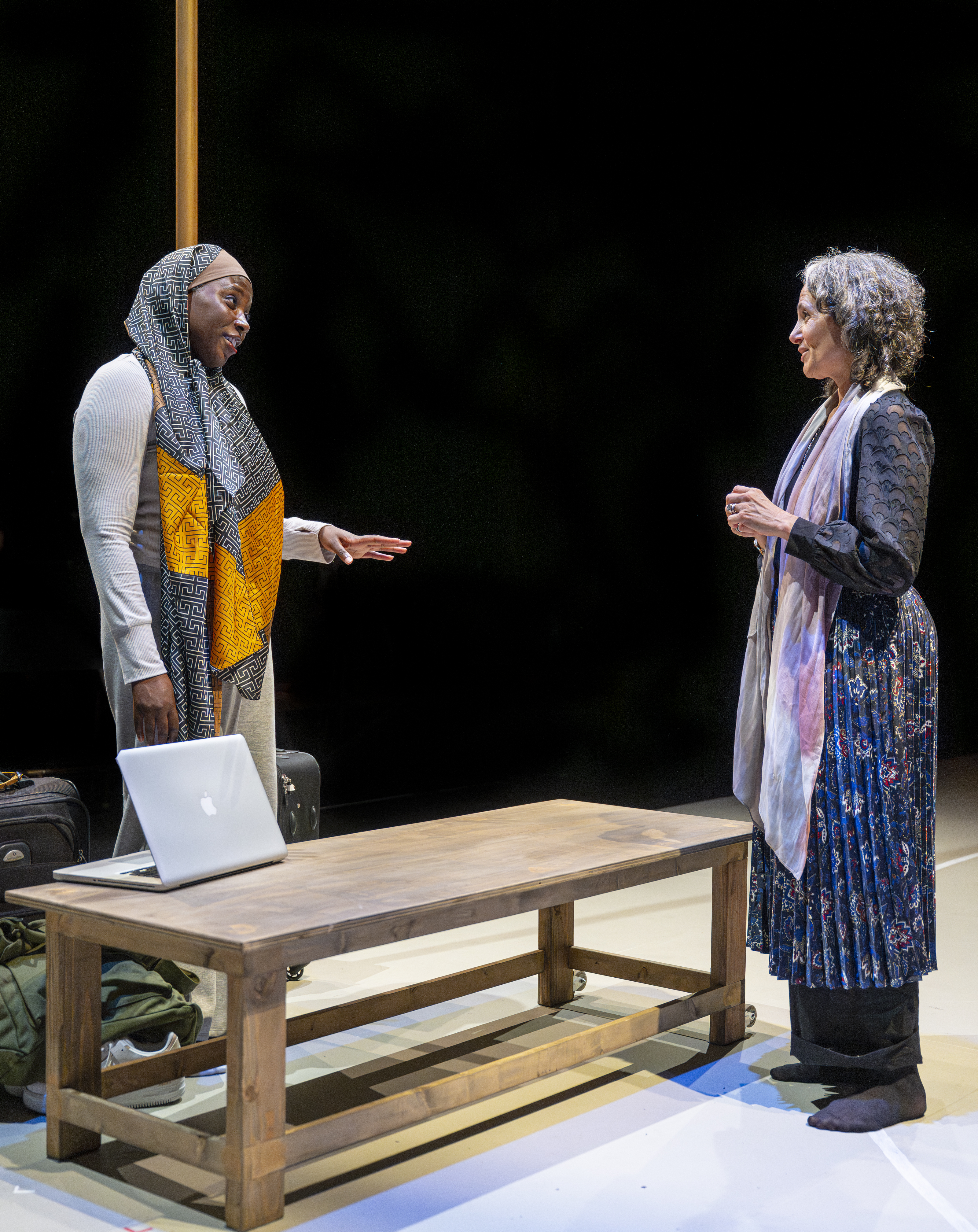 Nora el Samahy (Noor, right) and Jeunée Simon (Fatima) in Pilgrimage. Muslim women’s voices are foregrounded in this ensemble journey to Mecca. Presented by Golden Thread Productions and Z Space at Z Space’s Steindler Stage.