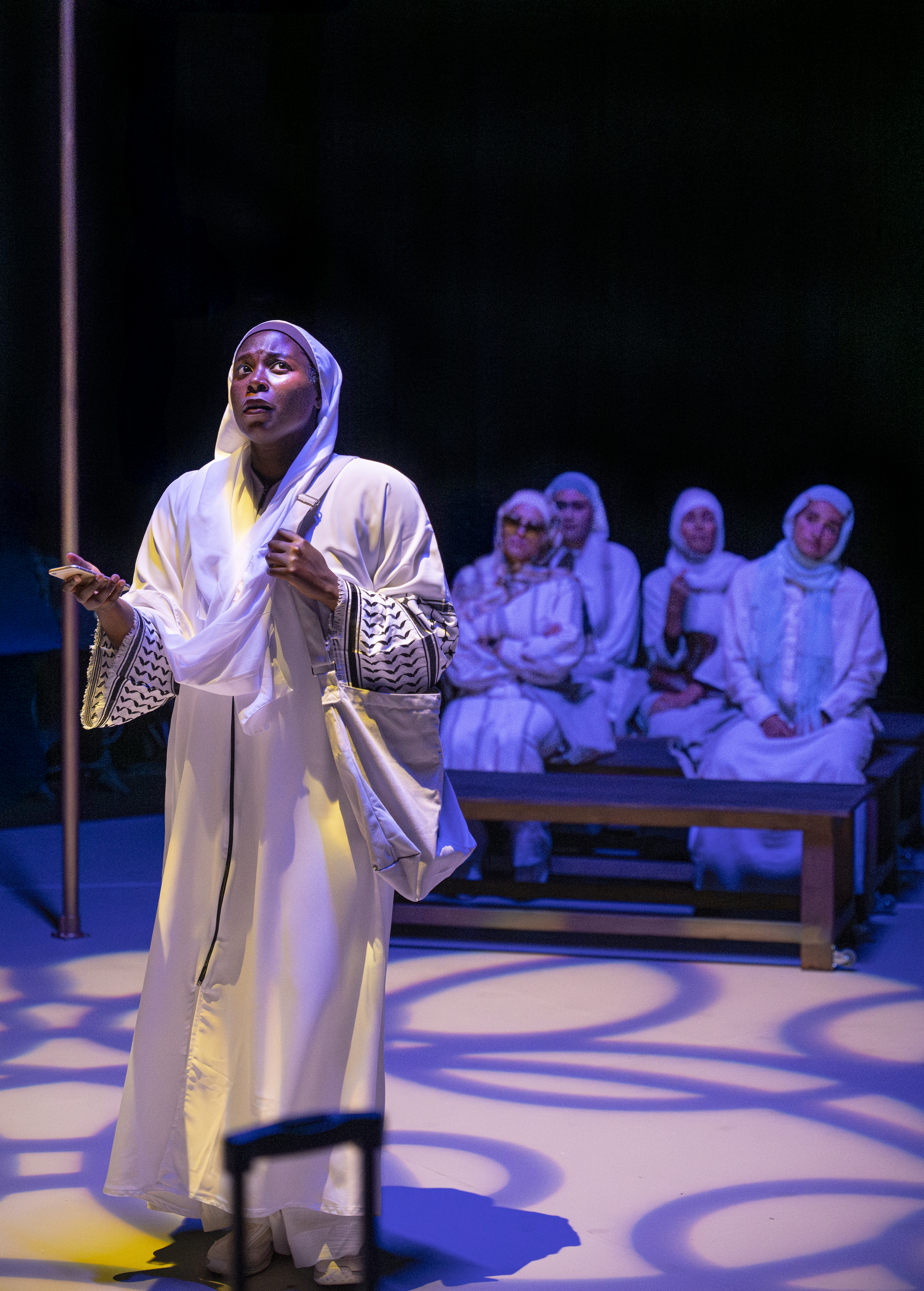 Jeunée Simon (Fatima) in Pilgrimage. A convert seeking belonging joins fellow pilgrims on a transformative journey. Presented by Golden Thread Productions and Z Space at Z Space’s Steindler Stage, Oct 24–Nov 9, 2025. Directed by Michelle Talgarow.