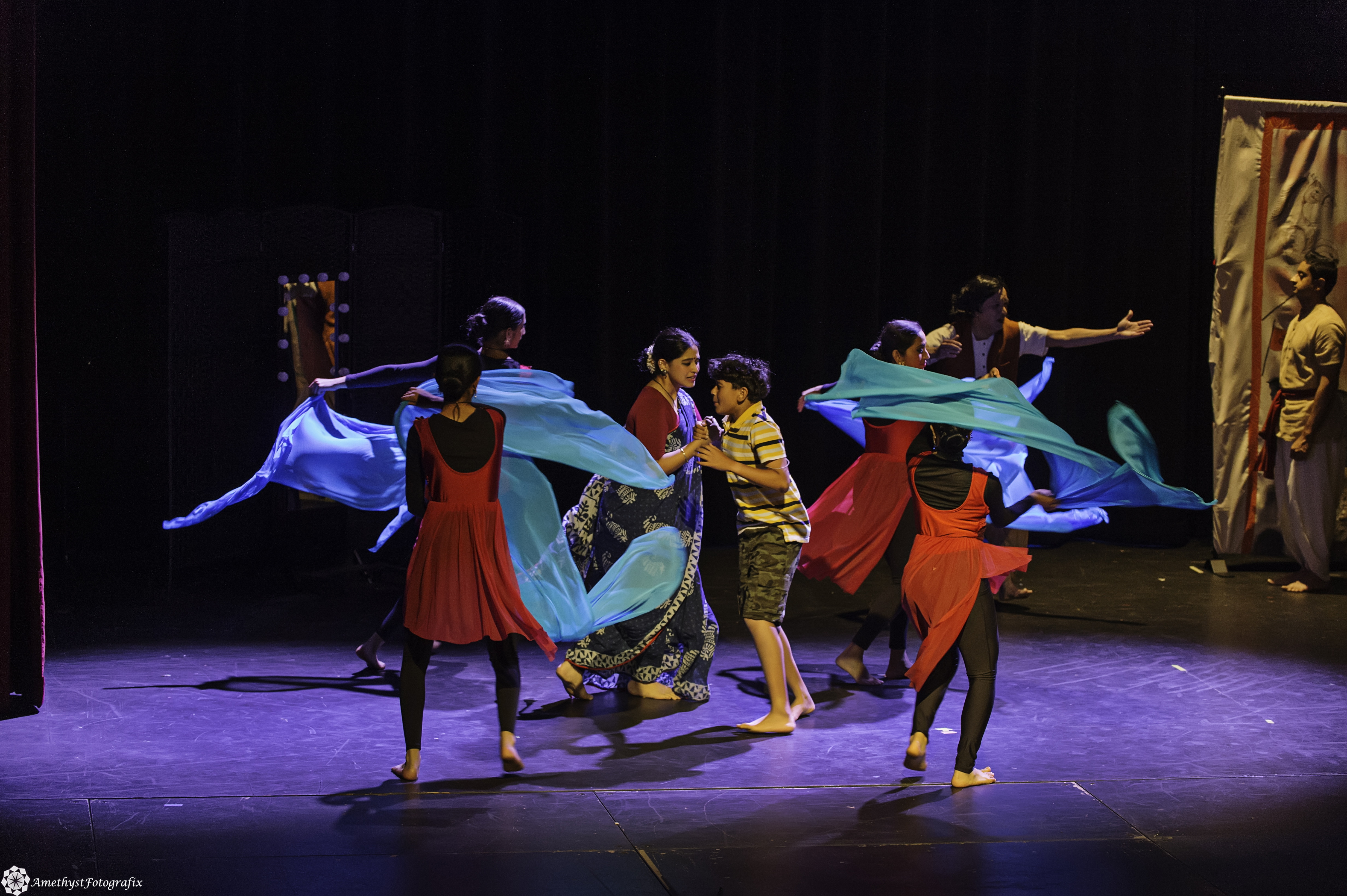 - A dynamic scene from Kaumudi combining character interaction with ensemble movement, using fabric and staging to enhance visual storytelling.