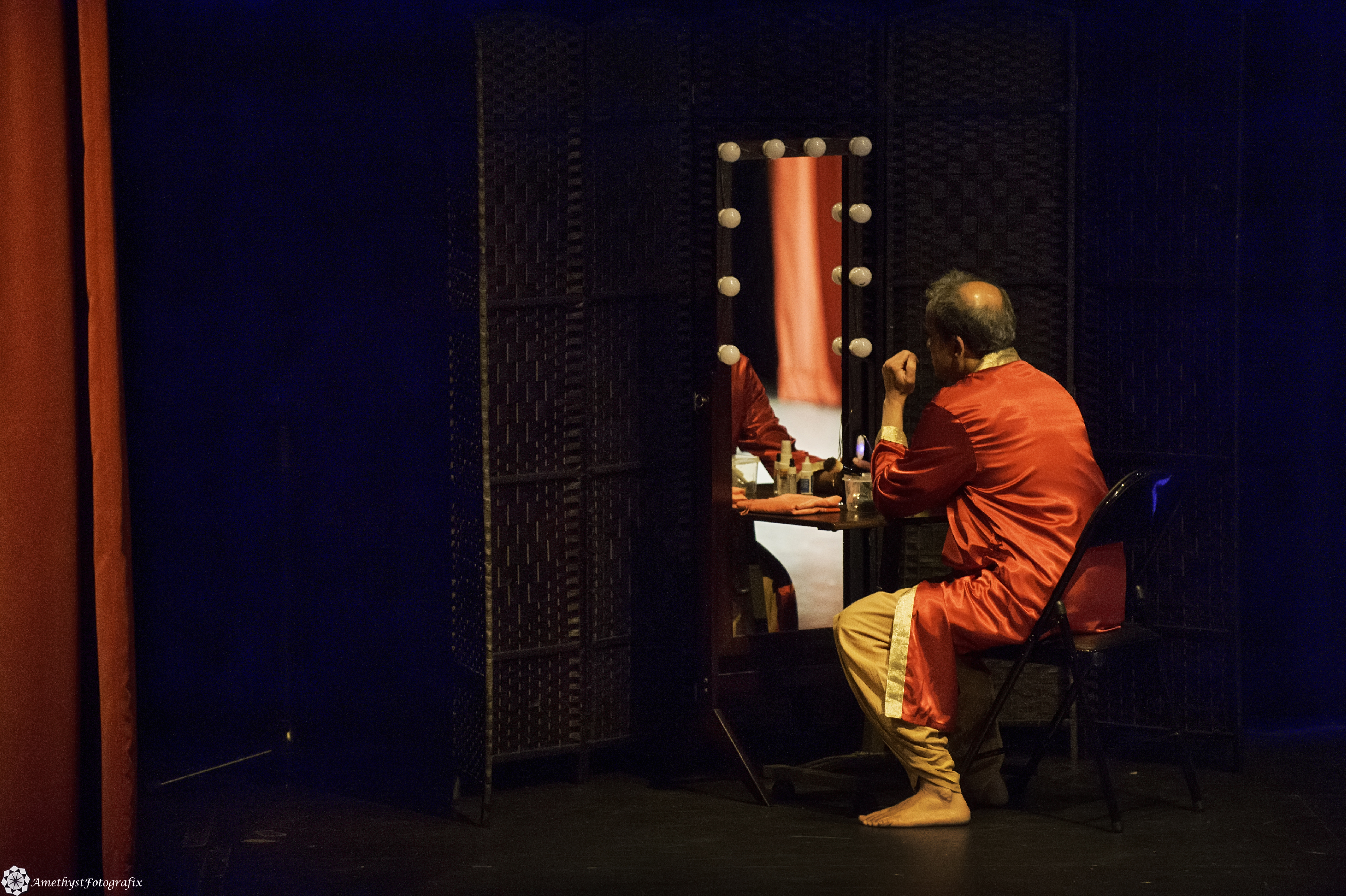 - Dressing room scene from Kaumudi. Sathyasheel immerses himself in preparation for this character on stage.