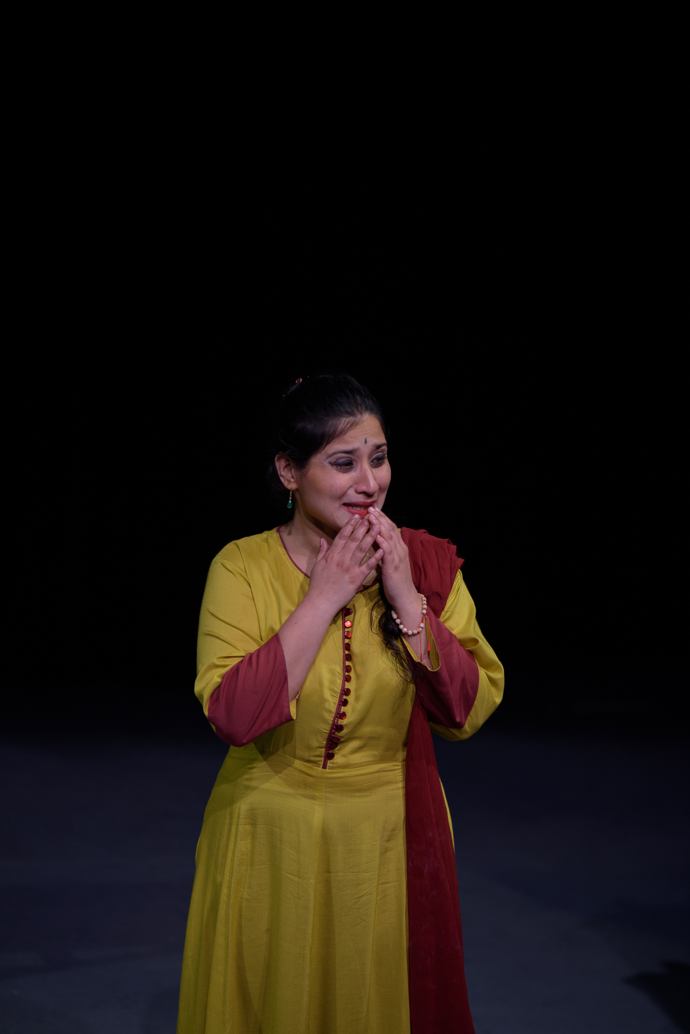- A performer in a moment of emotional expression from The Incomprehensible, highlighting the play’s exploration of inner conflict.