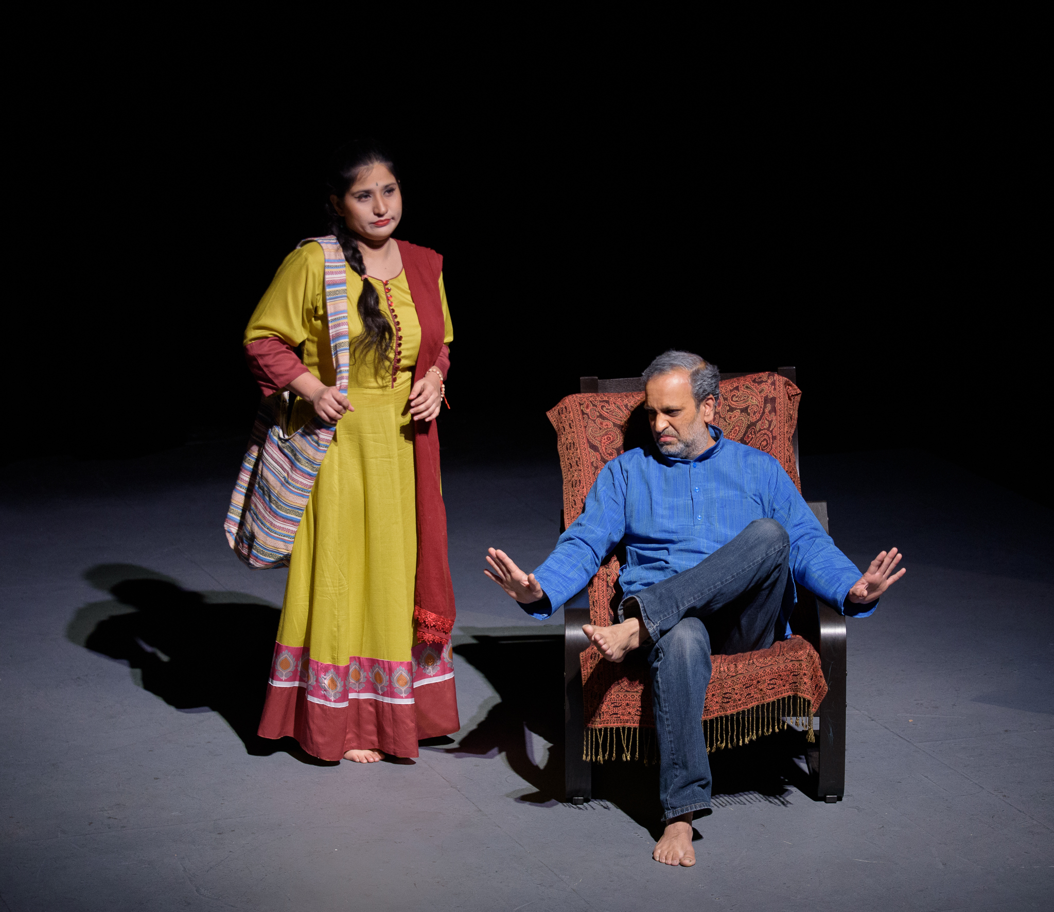 - Two performers in a staged interaction from The Incomprehensible, highlighting interpersonal tension and ethical conflict.