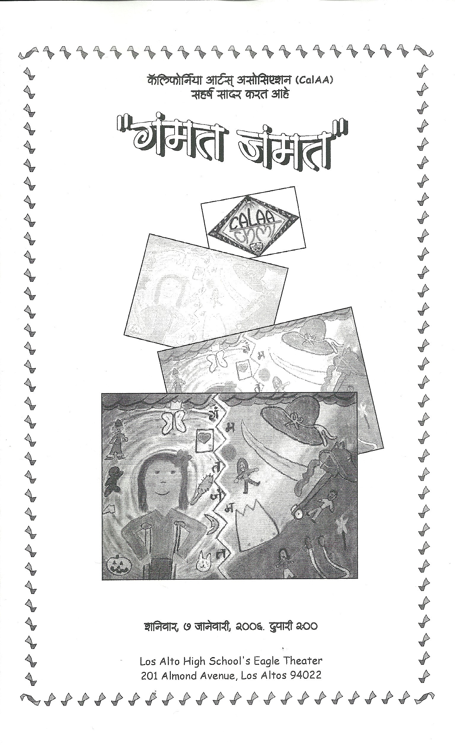 This 2006 poster for Gammat Jammat reflects the playful, imaginative spirit of CalAA’s children’s theater production. The hand-drawn aesthetic and layered imagery evoke a child’s dreamscape, visually reinforcing the story’s structure in which fantasy figures appear to encourage and inspire a young girl navigating physical disability. Presented in Marathi, the production marked an important expansion of CalAA’s programming into youth-centered theater. By staging children’s plays in a regional Indian language, CalAA fostered intergenerational language continuity while creating performance opportunities for young members of the Bay Area’s South Asian community.