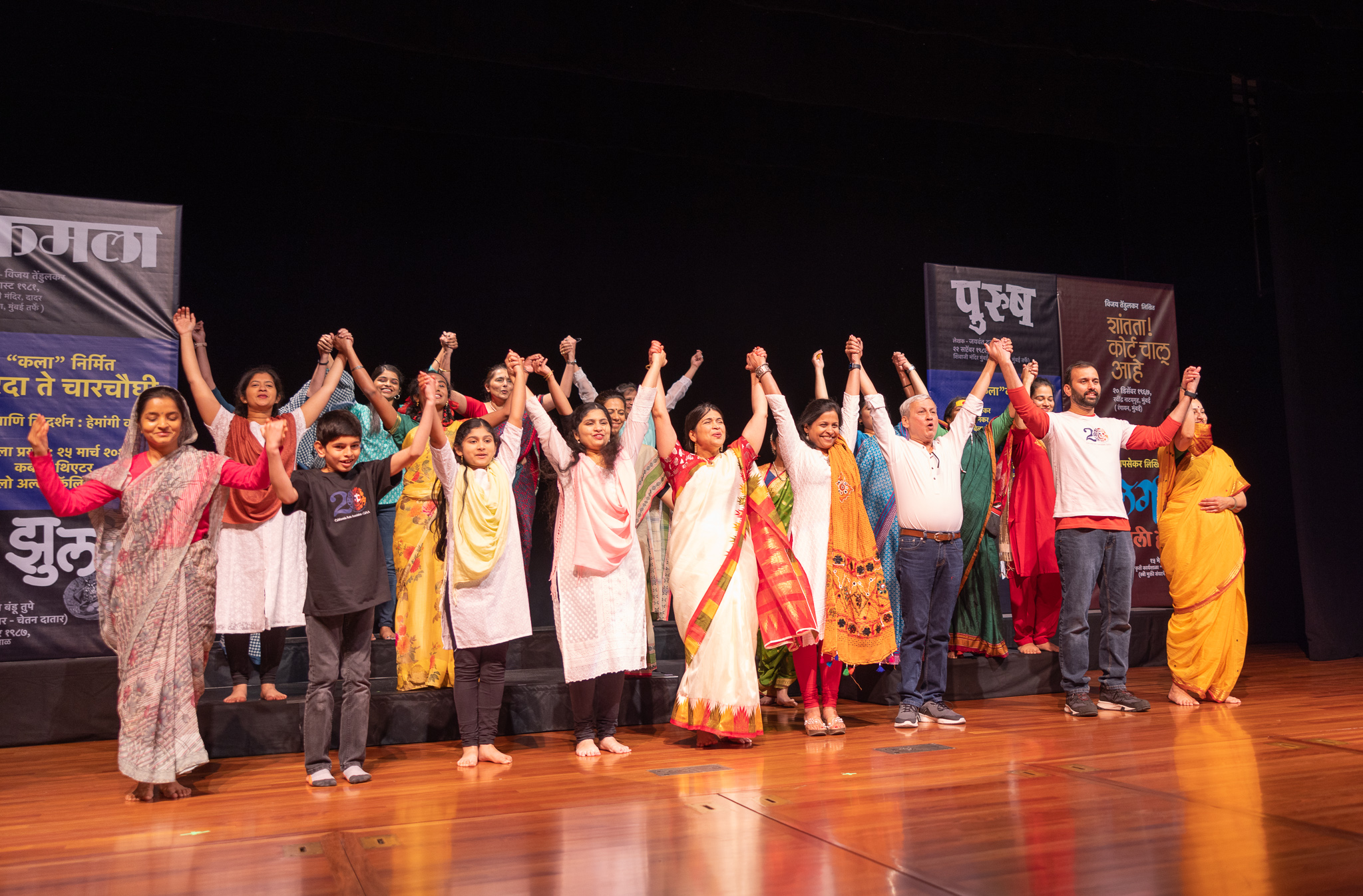 To mark CalAA’s twentieth anniversary, Sharda Te Char Choughi was conceived as a curated journey through the evolution of Marathi theater. The production featured staged excerpts spanning from Sharda, a landmark nineteenth-century social reform drama, to the modern play Char Choughi, alongside selections from works such as Kamala, Purush, and Shantata! Court Chalu Aahe, CalAA’s first major production in 2003. By juxtaposing canonical texts across eras, the program traced shifts in dramaturgy, performance style, and especially the representation of women on the Marathi stage.